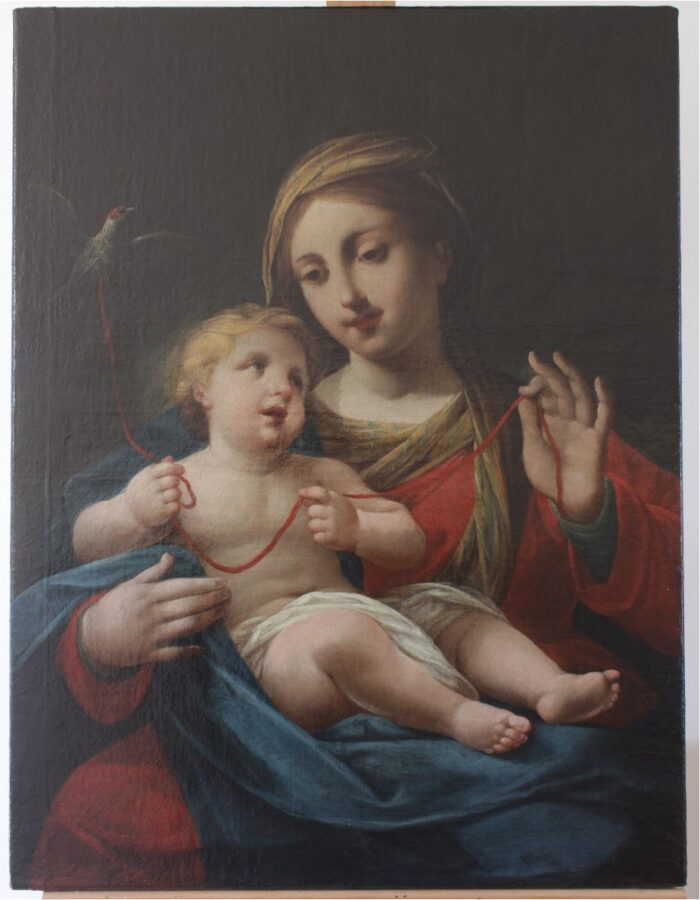 Olejomalba na plátně s motivem Madony s Ježíškem a stehlíkem je příkladem klasické pozdně barokní malby na tmavém bolusovém podkladu. Panna Maria v červeném šatu s modrým pláštěm a žlutým šátkem pravou rukou drží na svém klíně malého Krista, kterého se dotýká přes plášť. V prstech levé ruky má červenou stuhu, kterou má i Ježíšek ve svých ručičkách. Je zobrazen jako světlovlasé batole hledící vzhůru s bílou látkou kolem beder. Na konci stuhy se nad Kristem vznáší malý pták – stehlík, který bývá součástí tohoto ikonografického motivu. Pozadí je tmavé a postavy z něj vystupují v šerosvitu.