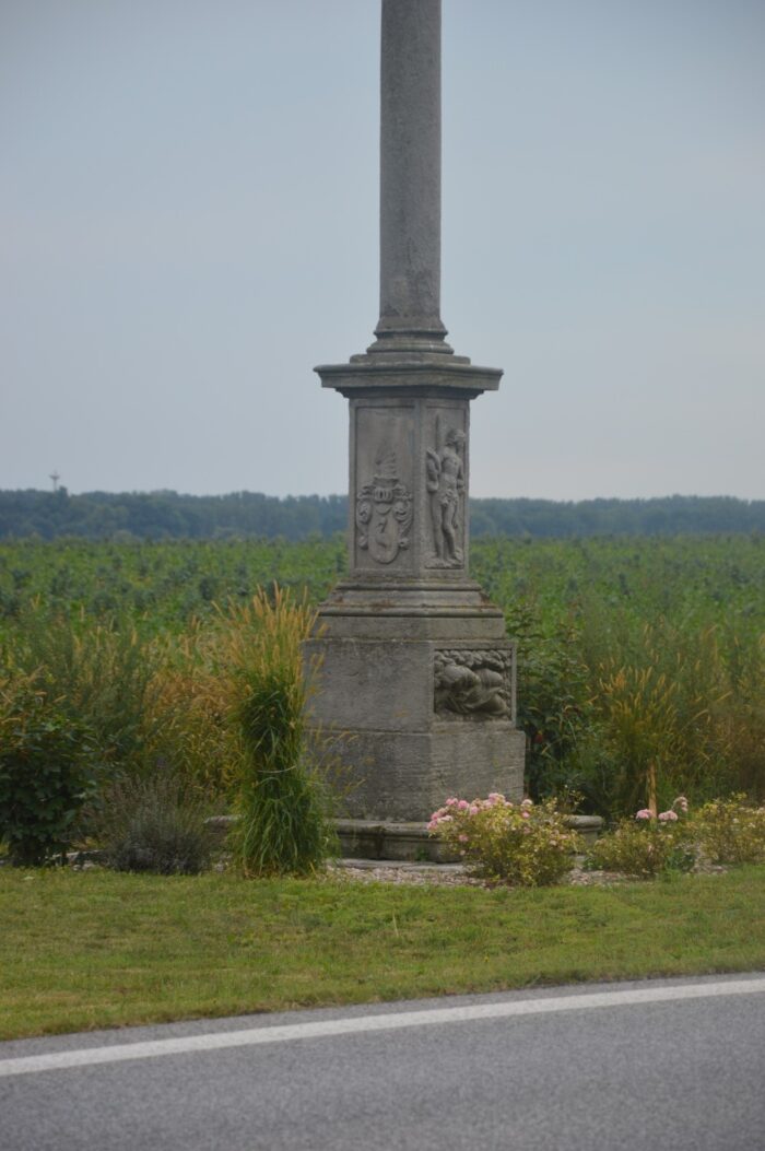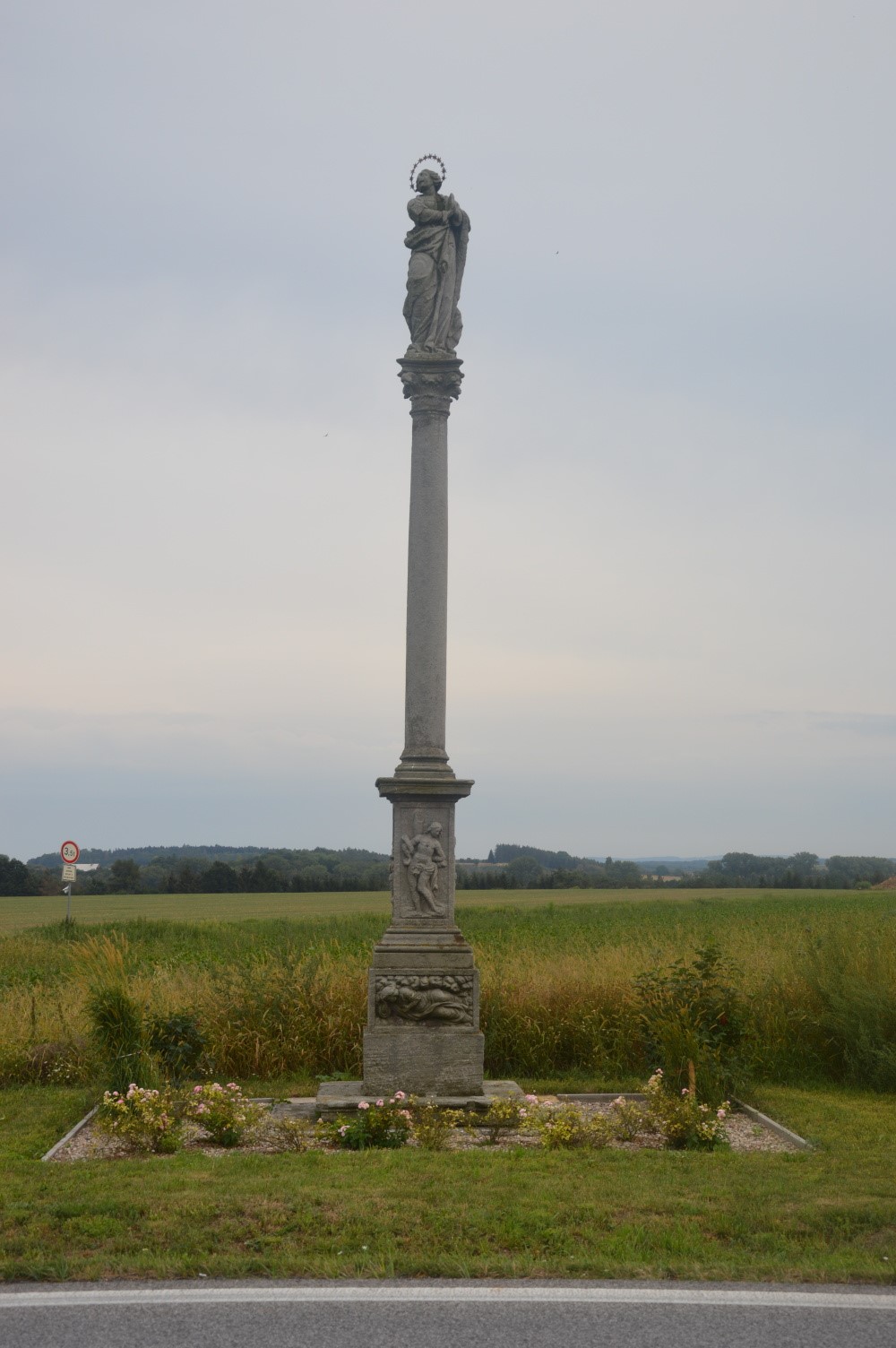 Na dvoustupňové pískovcové základně, jejíž spodní stupeň je utopen v terénu, horní stupeň zdobí přesazená horní římsička s oblounem, stojí dvoustupňový kvádrový podstavec. Na čelní stěně vrchní, mírně ustoupené části je reliéf světice ležící v růžích (sv. Rozálie). Světice má kolem hlavy věnec, pravou rukou si podpírá hlavu, levou má položenou na prsou, nohy má pokrčeny. Ostatní stěny kvádrového podstavce jsou hladké. Na podstavci stojí dva pilíře, spodní čtyřstěnný s výrazně přesazenou profilovanou patkou a hlavicí. Profil patky je deska, obloun, obrácená sima, obloun, pásek, profil hlavice je fabion, deska, pásek, obloun.