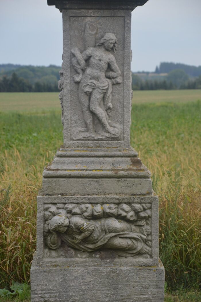 Dřík tohoto pilířku má zapuštěná obdélná zrcadla s reliéfní výzdobou. Na čelní stěně reliéf sv. Šebestiána – nahá postava v esovité křivce s rozevlátými vlasy a rouchem kolem pasu, pravou ruku má pokrčenu a položenu na boku, levou má pokrčenou s dlaní za zády. Za zády mu oblézá had (?), za levým ramenem má pouzdro na šípy. Na boční stěně čelně vlevo je erb Dobřenských z Dobřenic – čáp uprostřed španělského štítu, na němž je posazen turnéřský helm, klenot tvoří orlí křídlo posazené na koruně, přikrývadla tvoří pera. Čelně vlevo je erb paní Bořinky Dobřenské rozené ze Lhoty (?) – v renesančním štítu zkřížené vidle, na štítu turnéřský helm, klenot tvoří paví pera posazená na koruně, přikrývadla rozviliny z per. V zadním zrcadle jsou kapitálou vytesány iniciály s vročením F. R. D. Z. D. / M. M. D. R. / B. Z. L. / 1684 (Ferdinand Rudolf Dobřenský z Dobřenic / Marie Magdalena Dobřenská rozená / Bořinka z Lhoty).