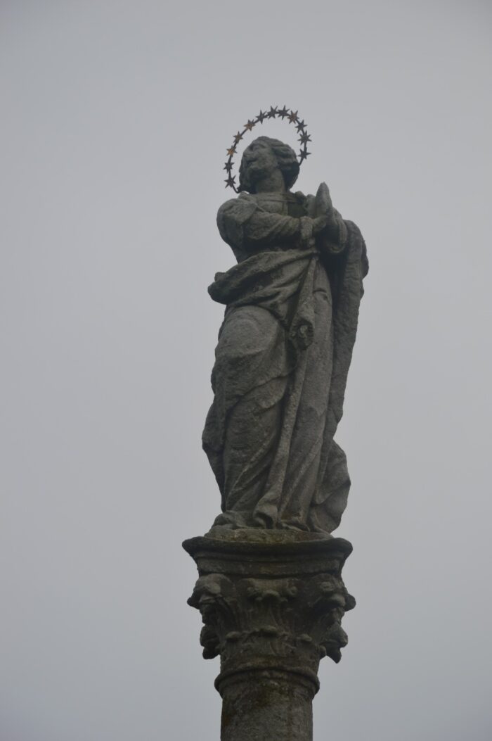 Vrchní sloup má hladký dřík s entasí, prstencovou patkou a pseudokorintskou hlavicí. Na hlavici stojí socha Panny Marie. Socha v esovité křivce s těžištěm na levé noze, pravou nohu má pokrčenou, levou vykročenou. Socha je pootočena doprava, mírně zakloněná hlava hledí rovněž doprava. Ruce má sepjaty modlící se ve výši prsou, kolem pasu má pozlacenou svatozář se dvanácti hvězdami. Oděna je v řasnatém rouchu. .