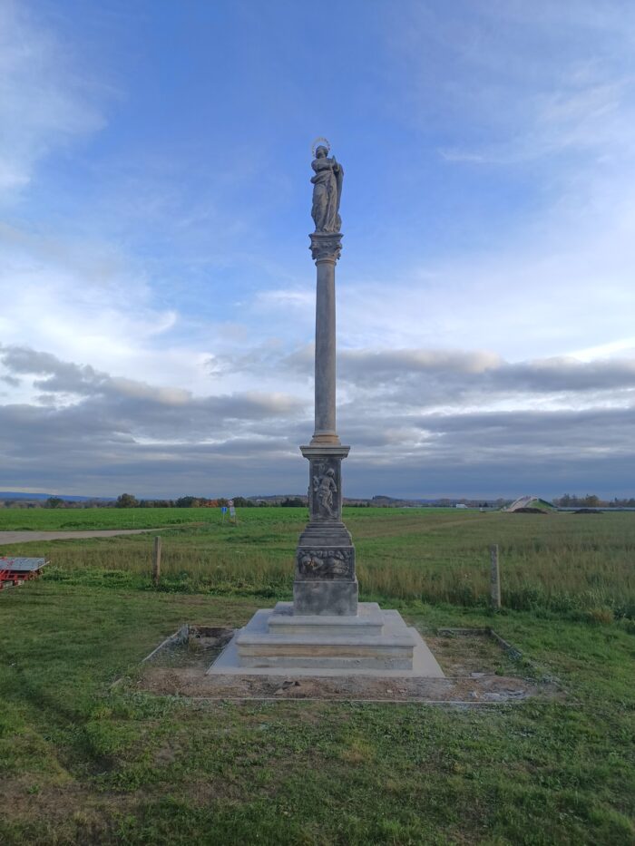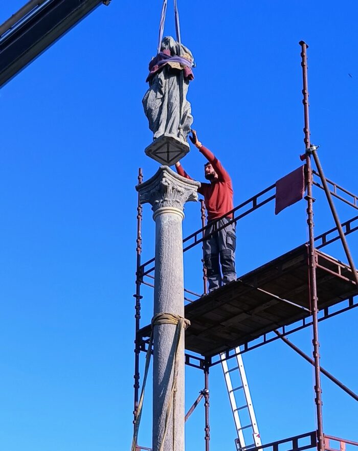 Památka byla silně staticky narušená, vlivem koroze čepů došlo k rozpraskání hlavice dříku i patky sloupu. Následkem dvou starších zásahů a oprav došlo k fatálnímu poškození sloupu, ten byl v minulosti rozebrán a uložen. Stav památky bylo možno klasifikovat jako silně havarijní a bez dalšího restaurování nebylo dílo možné prezentovat ve svém původním kontextu a lokaci. Před zahájením restaurování byl sloup rozdělený na mnoho dílů a deponovaný v budově technických služeb. Všechny díly jsme transferovali do ateliéru, kde byl sloup restaurován tak, aby mohl znovu sloužit svému původnímu účelu. Šlo o technicky náročný zásah, ale nakonec se dílo podařilo a sloup znovu zdobí krajinu v okolí Dolan.